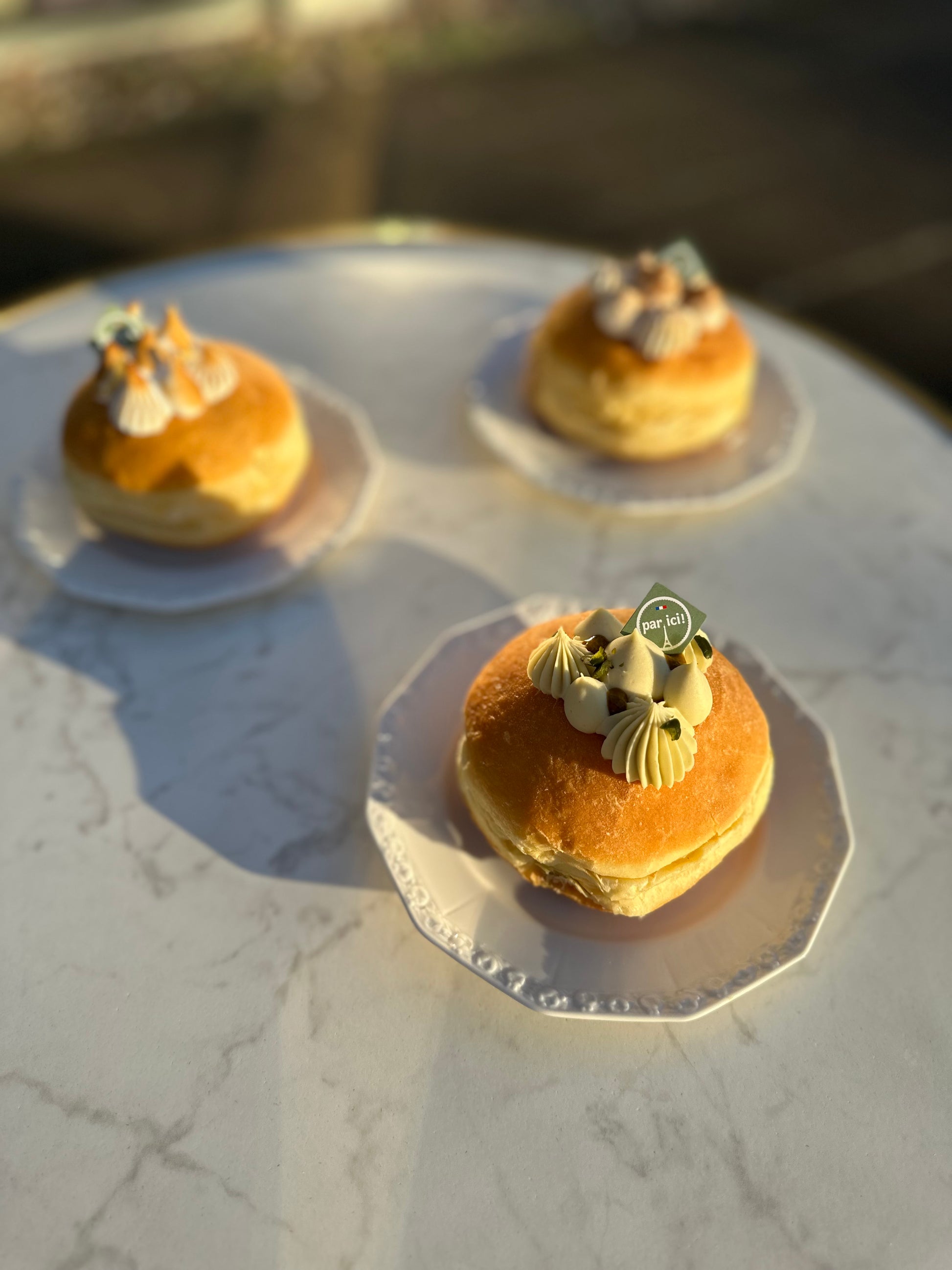 Berliner gefüllt mit einer vollmundigen Pistaziencreme getoppt mit Pistazien-Praliné