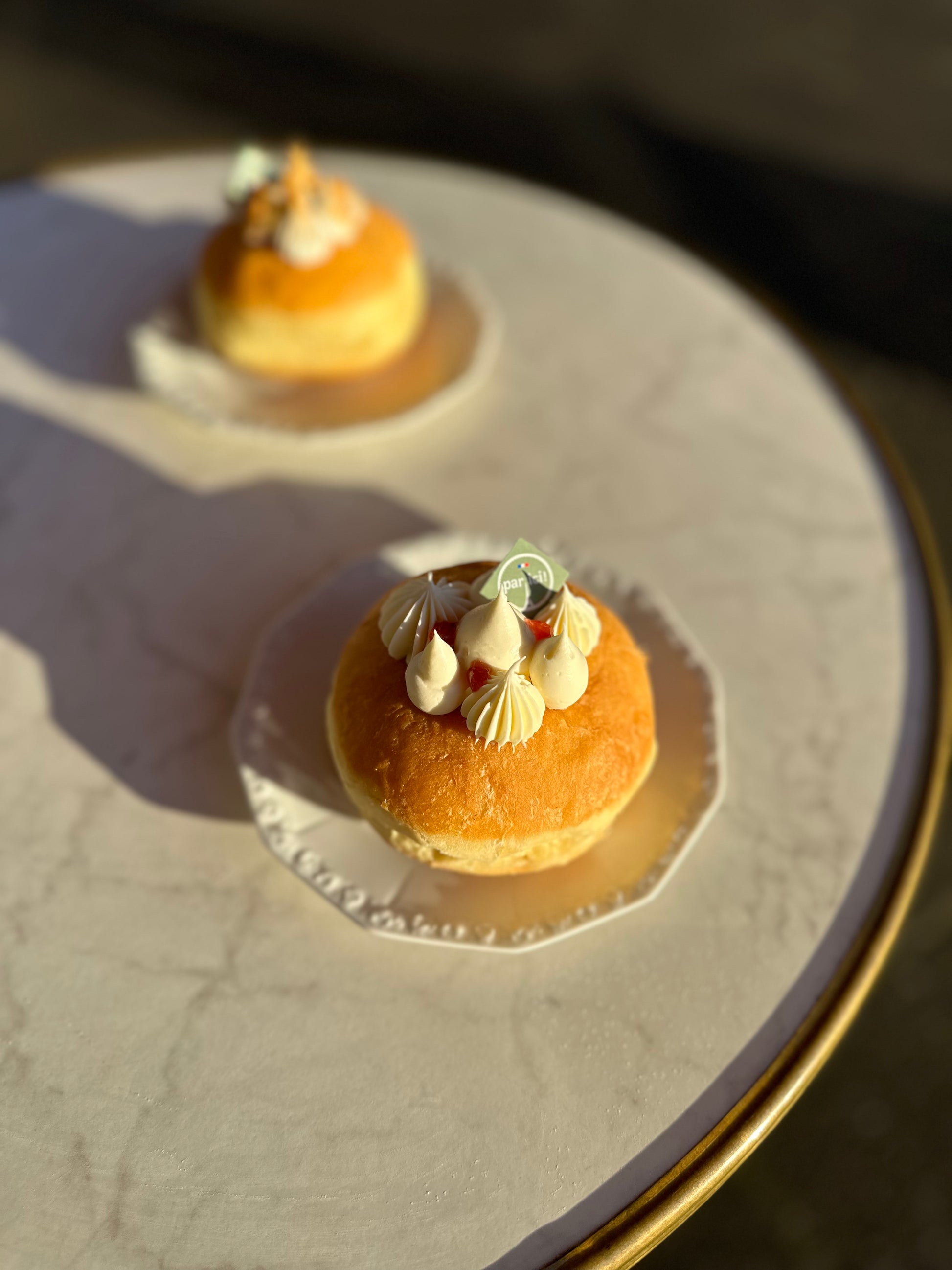 Berliner gefüllt mit unserer hausgemachten Erdbeer/Rhabarber Marmelade und getoppt mit einer Ganache aus weißer Schokolade.
